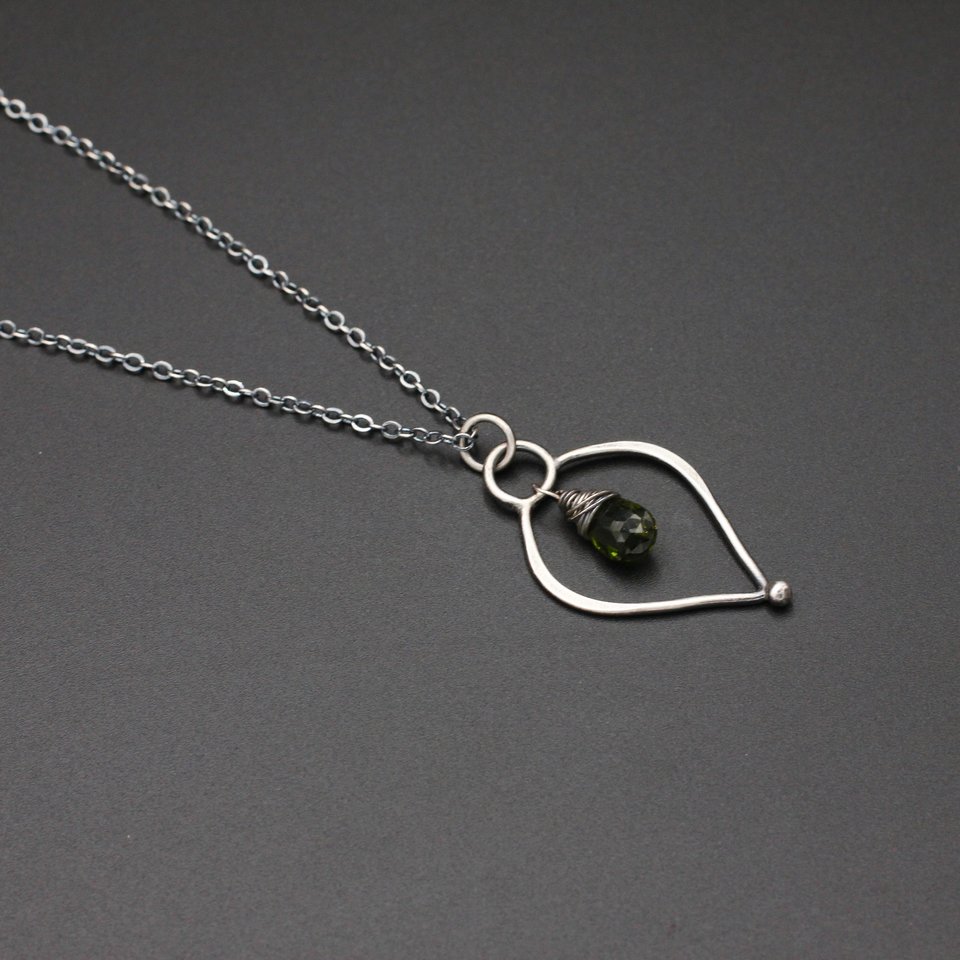 Sterling silver has been formed to create a flower petal. A faceted deep green chrome diopside gemstone hangs in the center. The pendant hangs from a delicate sterling silver chain.